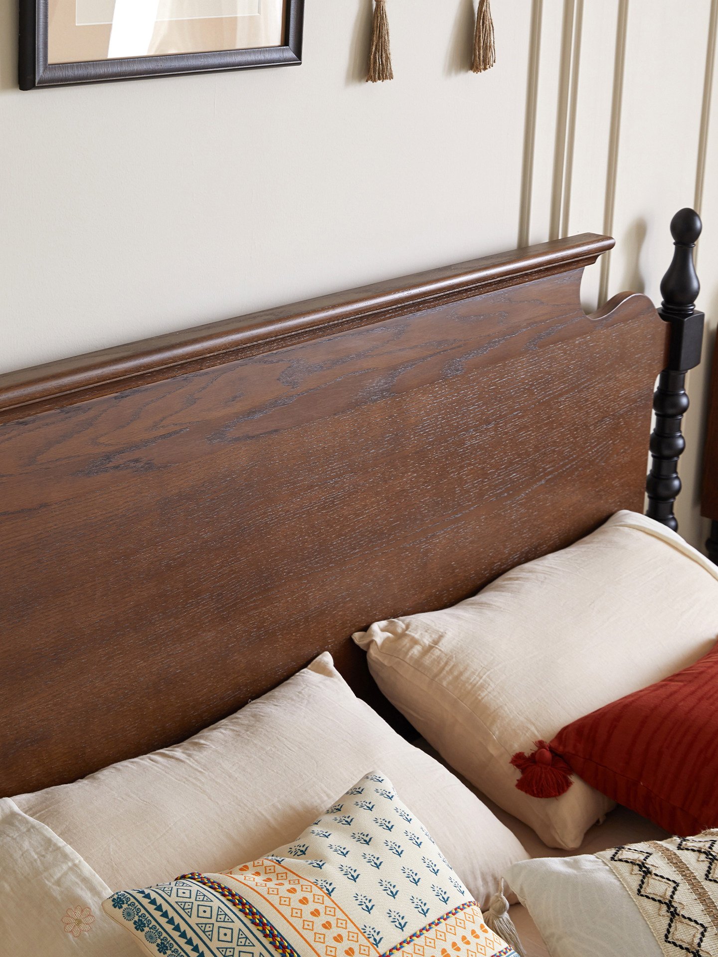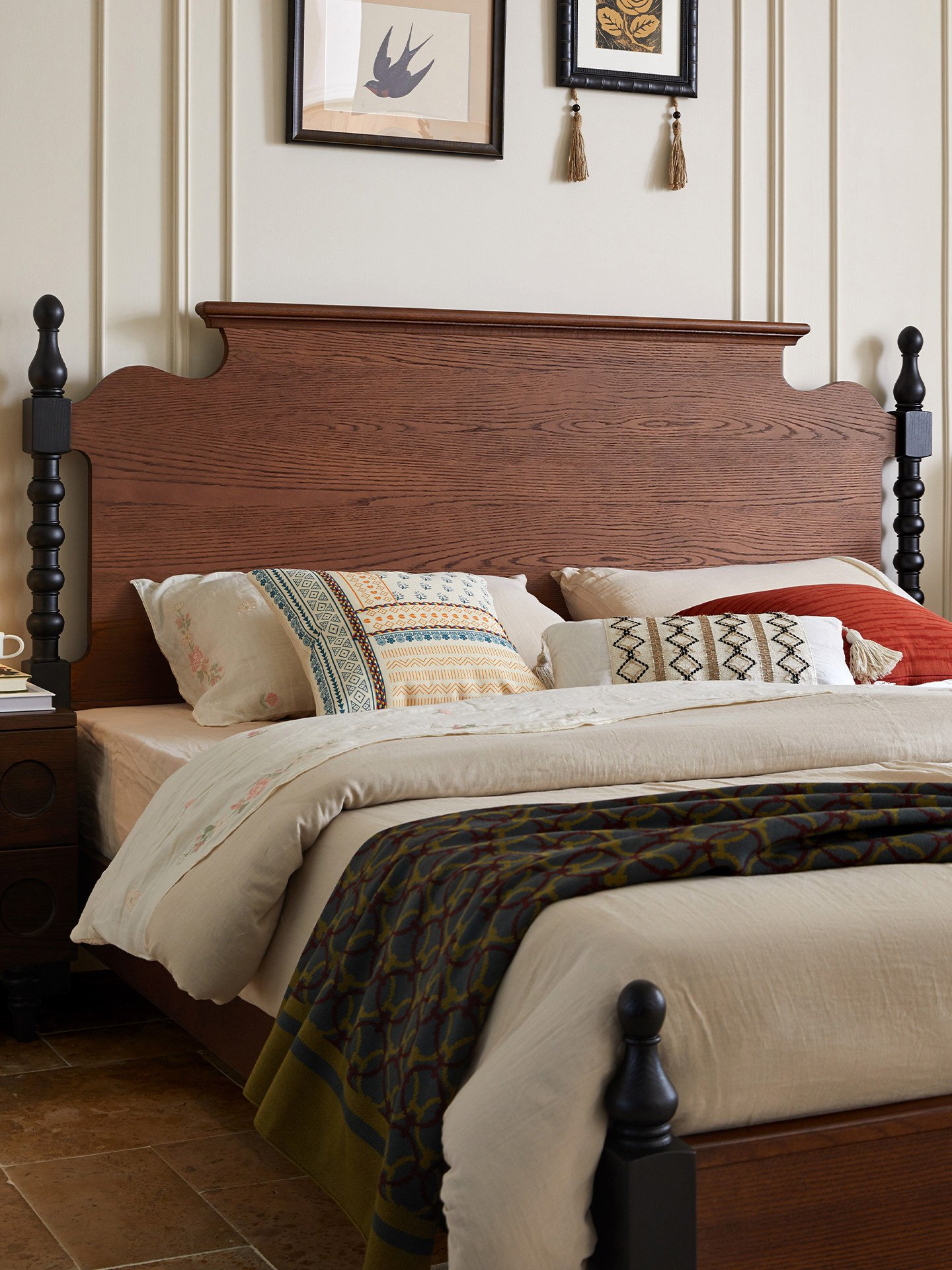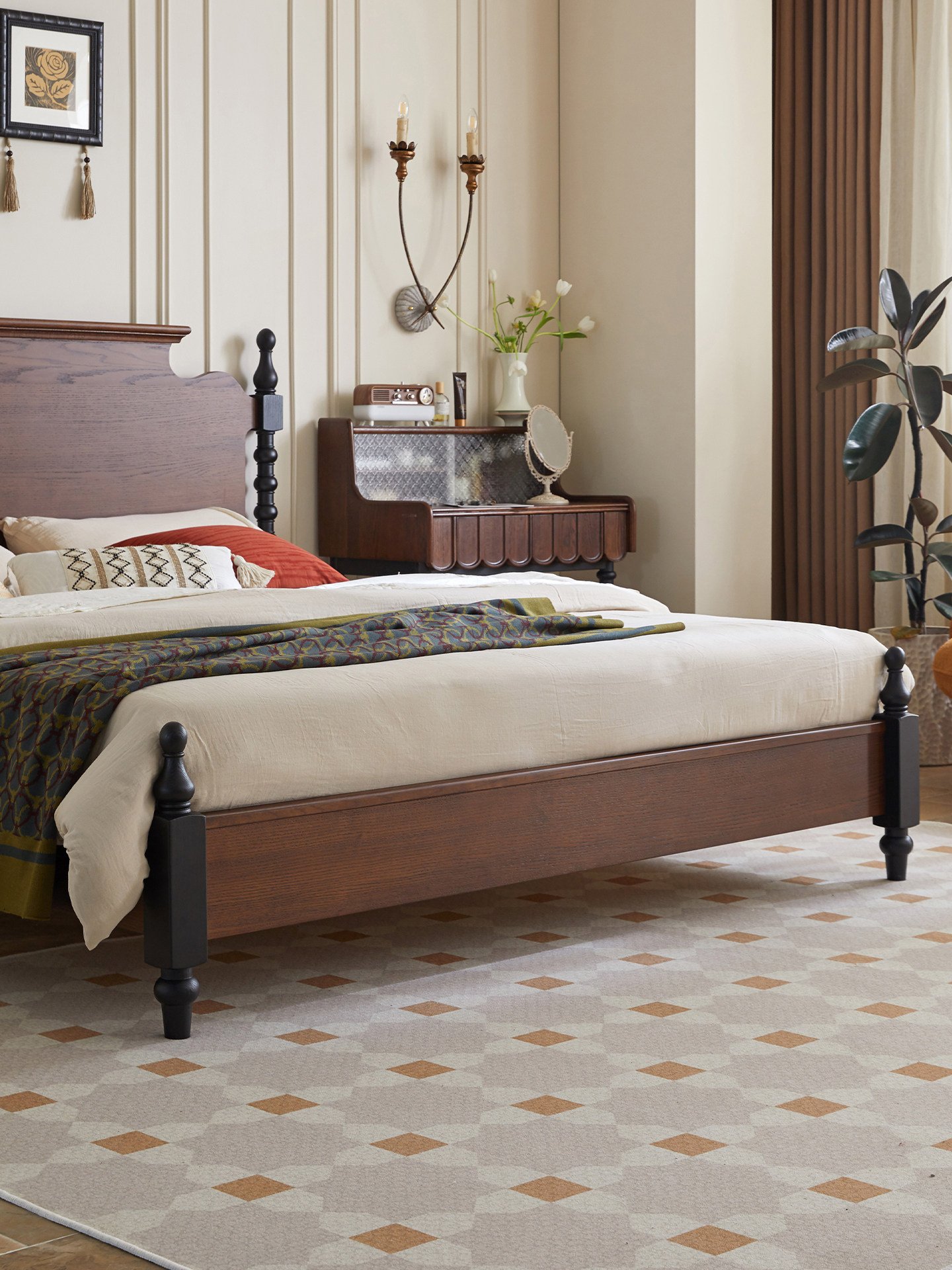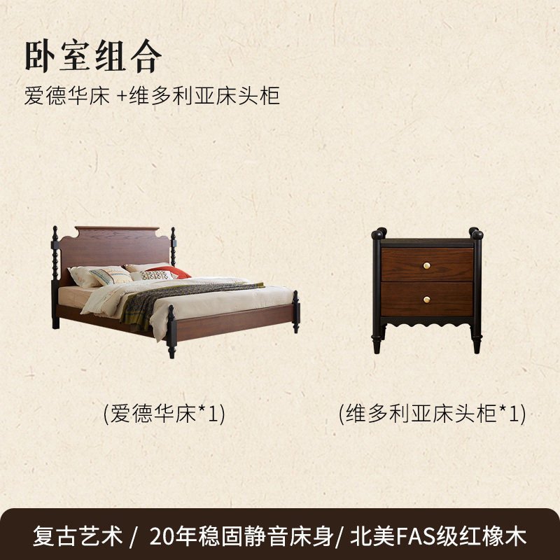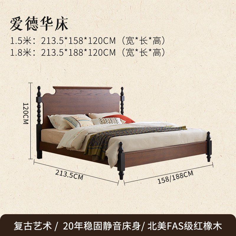 + Free ShippingFrench Retro Solid Wood Bed, 1.8m Queen Size Double Bed for Small Spaces, 1.5m Plank Bed, Mid-Century Vintage Furniture for Master & Home Bedrooms