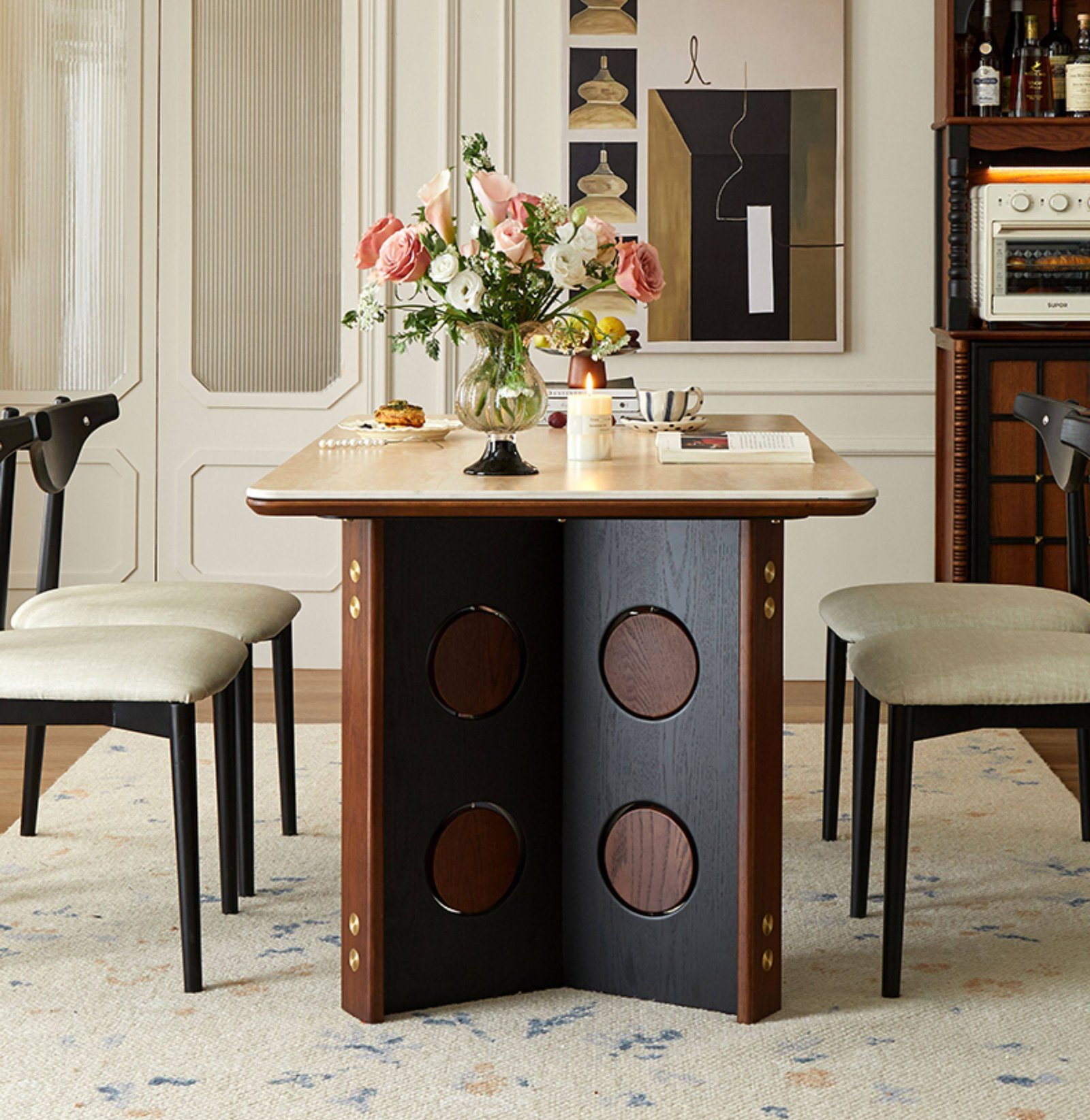 + Free ShippingMid‑century style travertine stone slab dining table and chair set for living room and home use, small‑apartment dining table