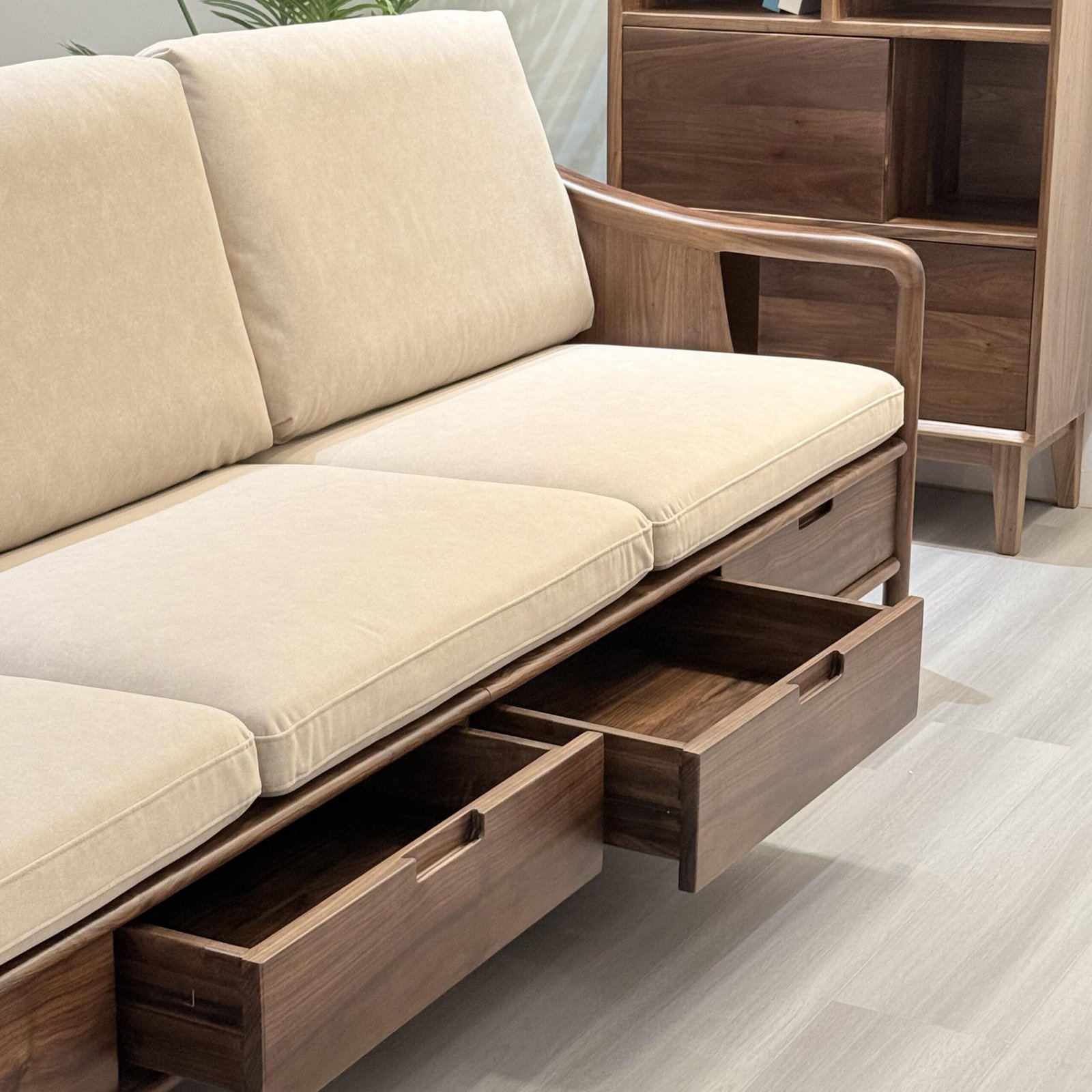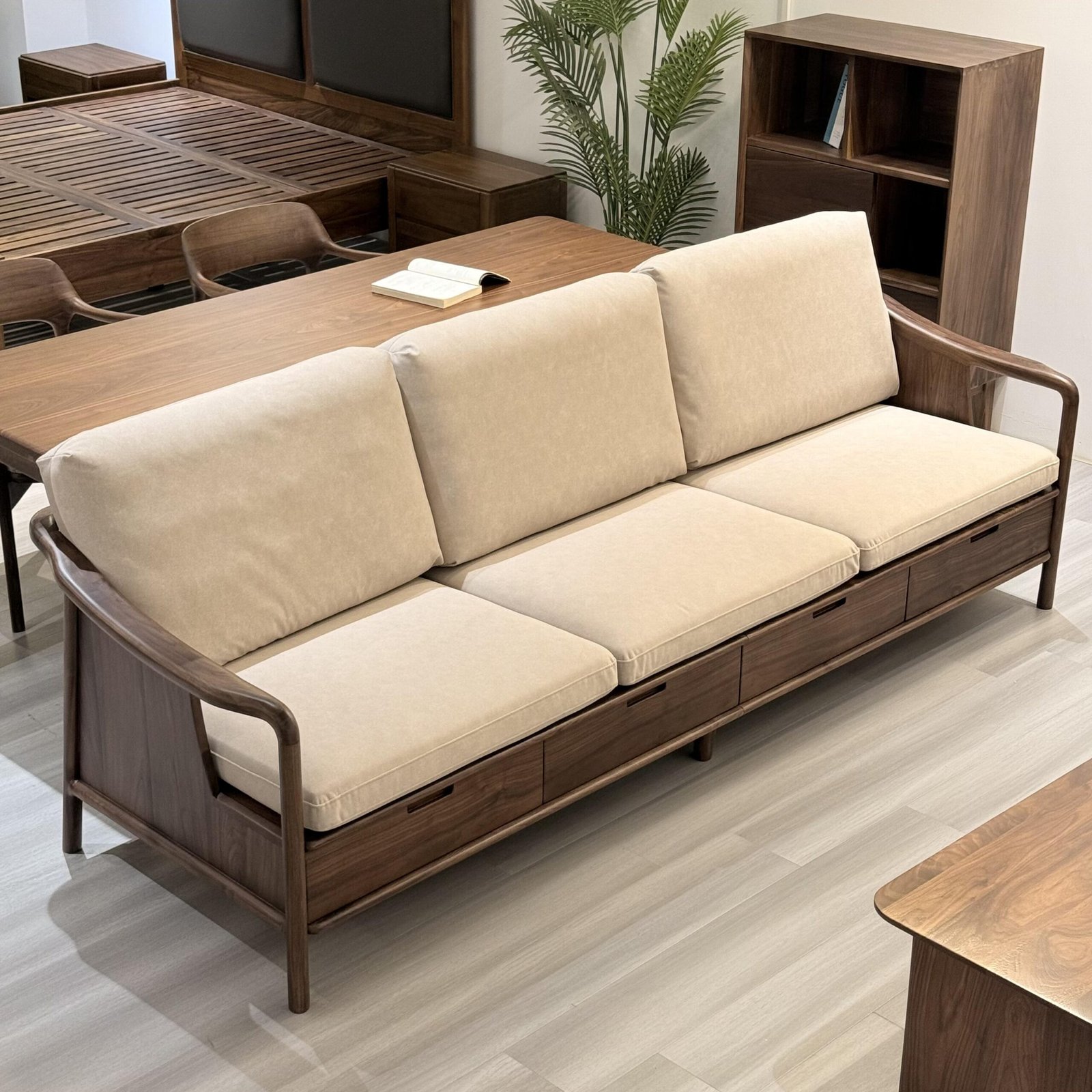 + Free ShippingNew Chinese-style Solid Black Walnut Sofa – Straight-Row, Modern & Minimalist 3-Seater Storage Sofa with Song Dynasty Aesthetics for Living Rooms
